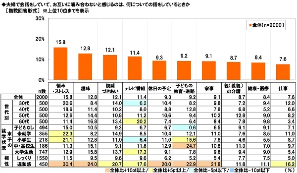 ■夫婦で会話をしていても噛み合わない話題 1位「悩み・ストレス」2位「趣味」3位「親戚づきあい」