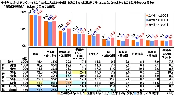 全回答者(2,000名)に、今年のゴールデンウィークに、『夫婦二人だけの時間』を過ごすために旅行に行くとしたら、どのようなところに行きたいと思うか聞いたところ、「温泉」が45.4%で最も多く、次いで、「グルメ・食べ歩き」35.9%、「季節の花・自然巡り」22.6%、「季節のレジャー(潮干狩り・イチゴ狩りなど)」17.4%、「ドライブ」15.6%が続きました。