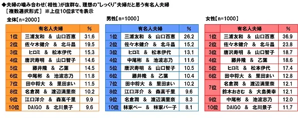 男女別にみると、上位2位までは同じとなったものの、3位以降で回答が分かれ、男性では3位「ヒロミさん・松本伊代さん」13.1%、4位「中尾彬さん・池波志乃さん」11.6%、5位「唐沢寿明さん・山口智子さん」10.5%となり、女性では3位「唐沢寿明さん・山口智子さん」18.7%、4位「藤井隆さん・乙葉さん」18.6%、5位「ヒロミさん・松本伊代さん」17.4%となりました。