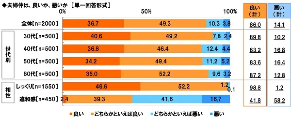 世代別に『良い(計)』をみると、30代89.8%、40代83.2%、50代83.6%、60代87.2%となっており、40代、50代では一度下がるものの60代では9割近くに回復し、M字カーブを描く結果となりました。40代や50代で夫婦仲が悪化してしまった夫婦も、60代になる頃には、夫婦の円満を取り戻しているのではないでしょうか。