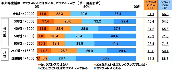 そして、【夫婦生活】についてみると、『セックスレスではない(計)』(「セックスレスではない」と「どちらかといえばセックスレスではない」の合計)は34.1%、『セックスレスである(計)』(「セックスレスである」と「どちらかといえばセックスレスである」の合計)は66.0%となりました。3人に2人が、自分たち夫婦はセックスレスであると感じているようです。