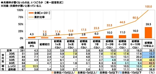 続いて、夫婦仲が悪いと思っている人(281名)に、夫婦仲が悪くなったのは、いつごろか聞いたところ、「結婚後2~3年くらい」が10.0%、「結婚後4~5年くらい」が11.0%、「結婚後6~10年くらい」が16.0%となり、累計をみると、『結婚後3年以内』が33.5%、『結婚後5年以内」が44.5%、『結婚後10年以内』が60.5%となりました。夫婦仲が悪い夫婦の3組に1組が結婚してから3年以内に夫婦仲が悪くなっていることがわかりました。