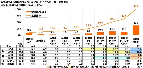 夫婦の会話時間は少ないと思う人(695名)に、夫婦の会話時間が少なくなったのは、いつごろか聞いたところ、「結婚前から」が9.5%と約1割が結婚前から夫婦の会話時間が少ないと回答しました。また、「結婚後2~3年くらい」が10.8%、「結婚後4~5年くらい」が14.4%となり、『結婚後3年以内』が累計で36.0%、『結婚後5年以内』が累計で50.4%と半数以上となりました。夫婦の会話時間が少ない夫婦の3割半は結婚後3年以内、半数以上が結婚後5年以内に夫婦の会話時間が少なくなっていることがわかりました。