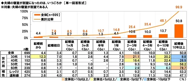 さらに、夫婦の寝室が別室である人(699名)に、夫婦の寝室が別室になったのは、いつごろか聞いたところ、「結婚後2~3年くらい」が10.6%、「結婚後4~5年くらい」が10.0%、「結婚後6~10年くらい」が13.7%となり、『結婚後3年以内』が25.4%と4組に1組、『結婚後5年以内』が35.4%と3割半、『結婚後10年以内』が49.1%と約半数になりました。夫婦の寝室が別室の夫婦の3割半が結婚後5年以内にお互いの寝室を別にしたようです。