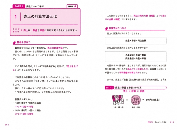 この本は会社の数字の超入門書ですが、決算書や簿記の話は一切出てきません。利益率を上げたいA子と、数字に詳しい課長による楽しいダイアローグからはじまり、小学校で習う算数の知識だけで、売上や利益の増やし方が理解できるようになっています。身近にあるお菓子を例に売上はもちろん、経費、利益率、儲け方について学べる仕組みです。
