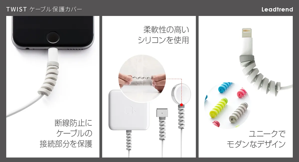 モバイルケース・アクセサリー専門の株式会社ロア・インターナショナル(所在地:東京都新宿区、代表取締役社長:Ally Won)は、「Lead Trend(リードトレンド)」からケーブルの接続部分を保護し、断線や抜け、ひび割れから保護するユニークでモダンなデザインのケーブル保護カバー「TWIST(ツイスト)」を発売しました。
