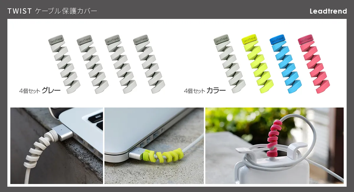 | 商品名 :TWIST ケーブル保護カバー 4個セット 商品ページ :http://www.mycaseshop.jp/lt40004 本体サイズ :φ0.9×3.5cm 重さ :4g(1個) バリエーション :グレーセット、カラーセット 素材 :シリコン 価格 :1,200円(税抜) |