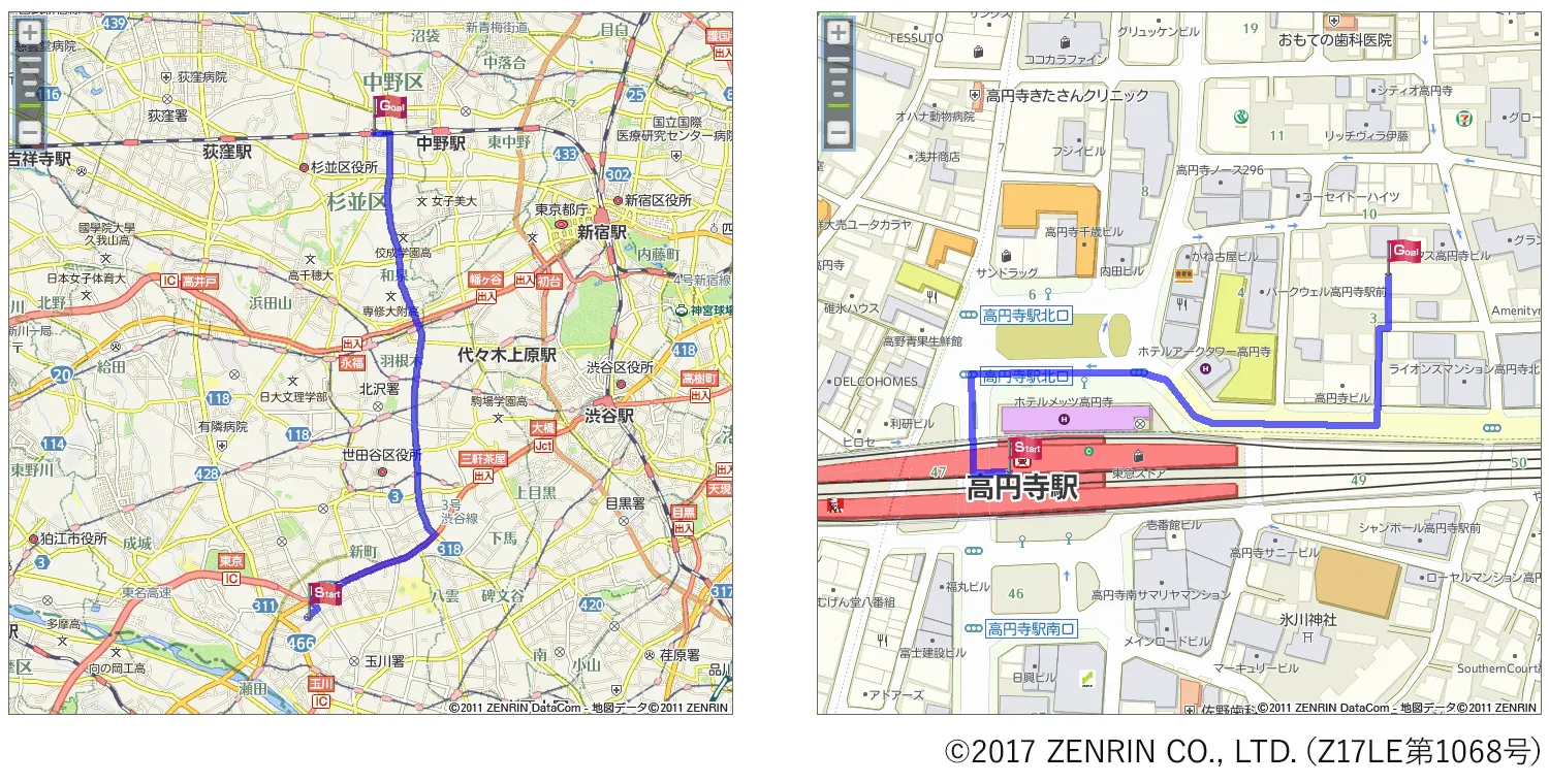 「いつもNAVI」などの地図・ナビゲーションサービスを提供している株式会社ゼンリンデータコムの高品質な地図サービスと連携しているため、自宅や目的地から最寄り駅までの徒歩/自転車経路はもちろんのこと、自動車通勤の経路も検索・表示することができます。