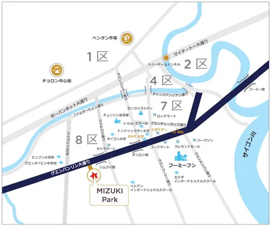 ●開発予定地のホーチミン市・ビンチャイン県は住宅開発が盛んな同市の南側エリアに位置し、今後ますますの発展が見込まれます。また、プロジェクト内に計画されるメイン道路は利便性の高い幹線道路(グエンバンリン大通り)と通じており、同市内中心部(CBD:中心業務地区)へも通勤圏内となります。