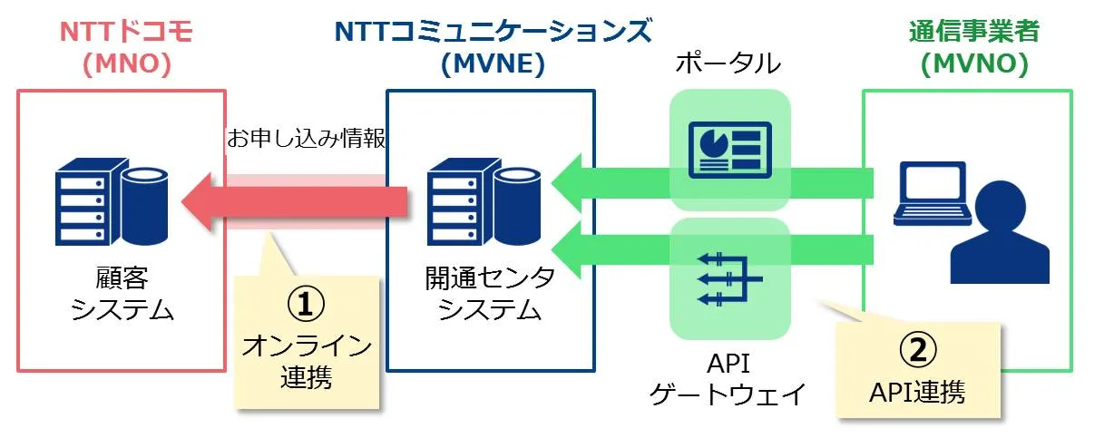 このたびのNTTドコモの顧客システムとのオンライン連携によって、NTT ComをMVNEとして利用するMVNOは「NTTコミュニケーションズ APIゲートウェイ」を介したSIMカードの開通などの迅速化やオペレーションの自動化が可能になります。