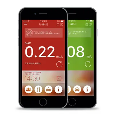 アプリのテスト結果に赤色の画面が表示された場合、アルコール濃度が法定制限を超えています。アプリが示す回復時間まで待ってから、もう一度測定してください。