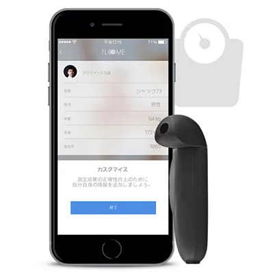 使い方は簡単。スマートフォンのイヤホンジャックにFLOOMEを差し込み、息を吹き込む。ただそれだけ。スマートフォンに直接結果を送信します。