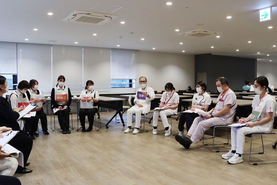 さらに来院時に体調不良を訴えるケースも想定し対応体制の確認を行いました。参加部門は、難病医療推進センター センター長 大薗恵一を中心に、看護部、業務推進部、施設管理部、救急科、戦略総務部が連携し、災害時の役割分担と情報共有の重要性を確認しました。