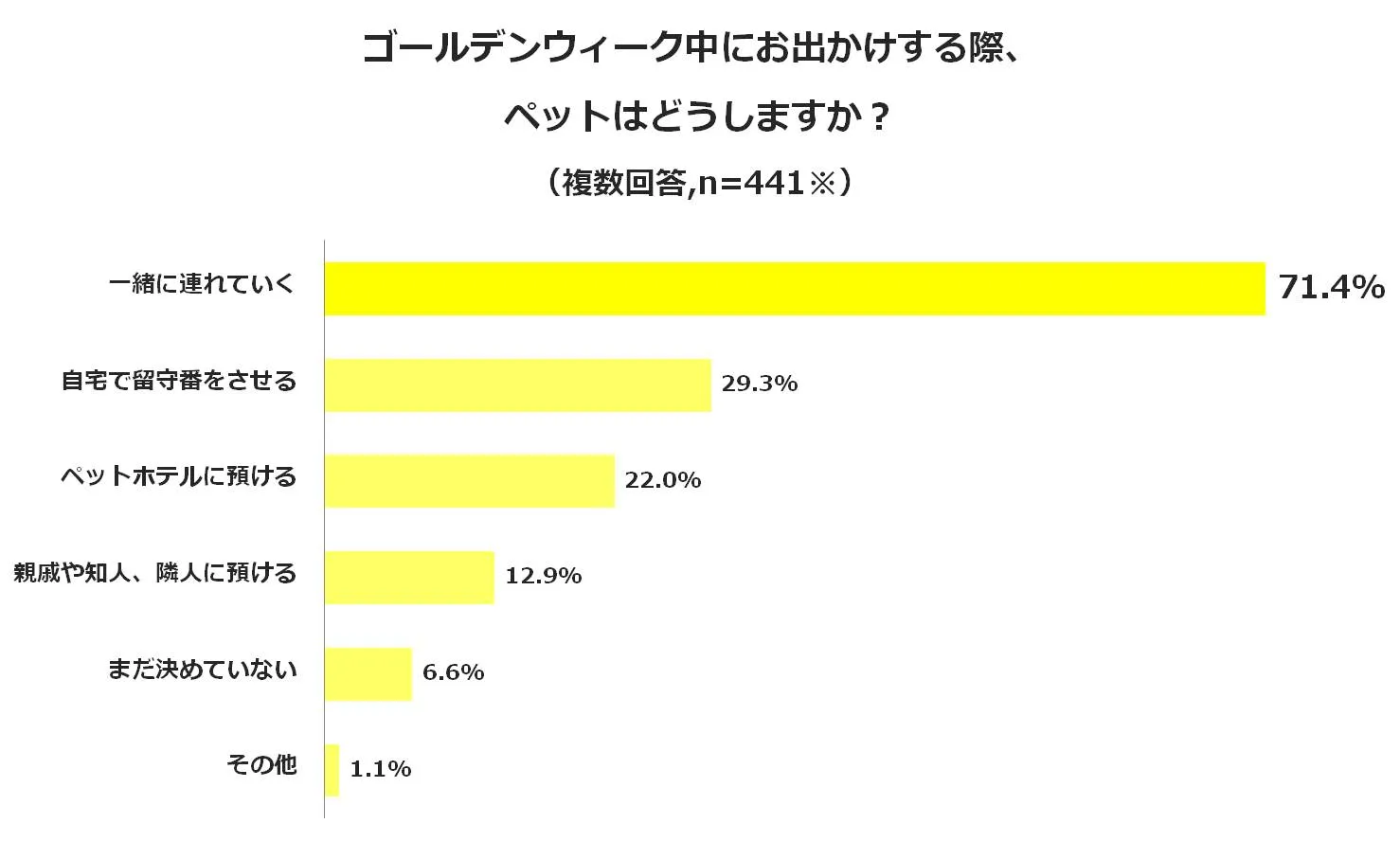 GW中のお出かけ時のペット同伴有無を聞きました。71.4%が「一緒に連れていく」と回答したことから、ペットとの外出を希望するペットオーナーが多いことが伺えました。一緒に連れて行かない場合は、ペットホテル、親戚や知人、隣人に預ける等、預け先を検討していることも分かりました。「まだ決めていない」という回答は6.6%に留まることから、お出かけの計画を立てる際はペットの同伴有無まで検討するオーナーが大多数であることが判明しました。