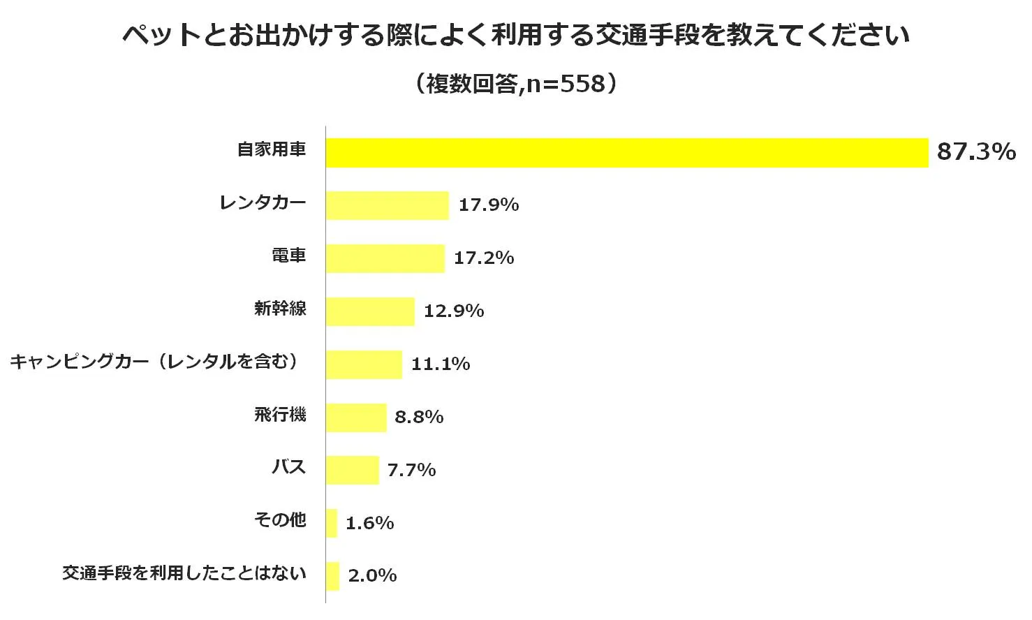 「自家用車」(87.3%)を始め、「レンタカー」(17.9%)や「キャンピングカー」(11.1%)と旅行中の自由度が高い車から、「電車」(17.2%)や「新幹線」(12.9%)といった公共交通手段まで多岐に渡りました。その他の交通手段としては、「フェリー」や「自転車」という回答がありました。「交通手段を利用したことはない」という回答が2.0%に留まることから、多くのペットオーナーが目的や行き先に合わせて交通手段を選択していることが見受けられました。