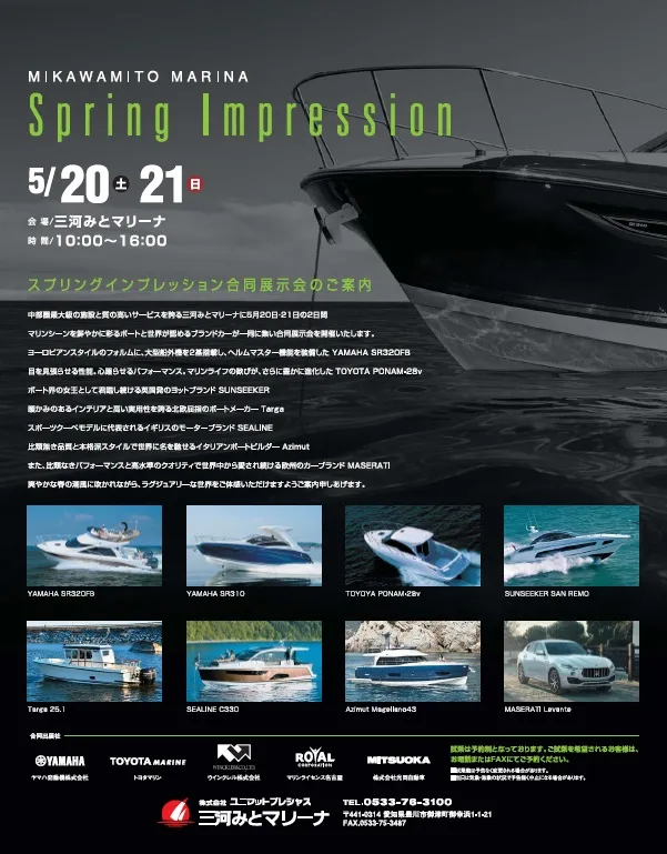 株式会社ユニマットプレシャス(本社 東京都港区)が運営する三河みとマリーナ(愛知県豊川市)は、平成29年5月20日(土)21日(日)三河みとマリーナにおいて国内外ラグジュアリーボート&世界が認めるカーブランドであるマセラティとが一同に集うスプリングインプレッション合同展示会を開催します。