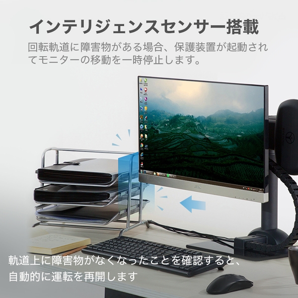 モニターを動かす回転軌道上に、障害物を察知すると一時的に運転を停止する「インテリジェンスセンサー」が搭載されております。