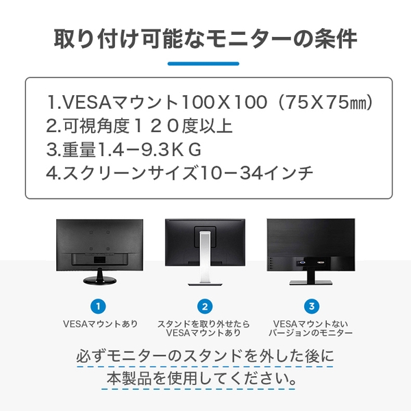 取り付け可能なモニターは10インチ~34インチサイズに対応しており、重さは最大9.3kgまで対応しています。