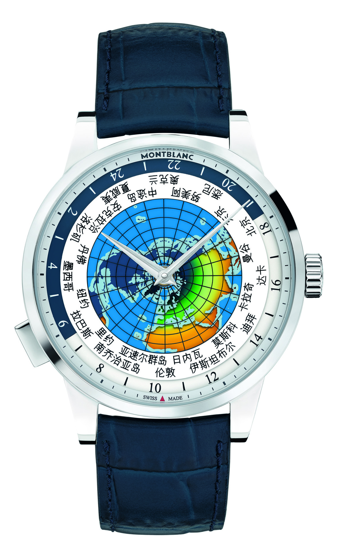 北極から見たスケルトンの大陸図にカラーダイアルを重ね、各時間帯の主要都市の現在時刻をひと目で読み取ることができるワールドタイマー「モンブラン オルビス テラルム」の限定品。ユニセフブルーのレザーストラップと、ラテン語と中国語で書かれた都市名リングが、子どもたちを想う真心には国境が無いことを表現します。