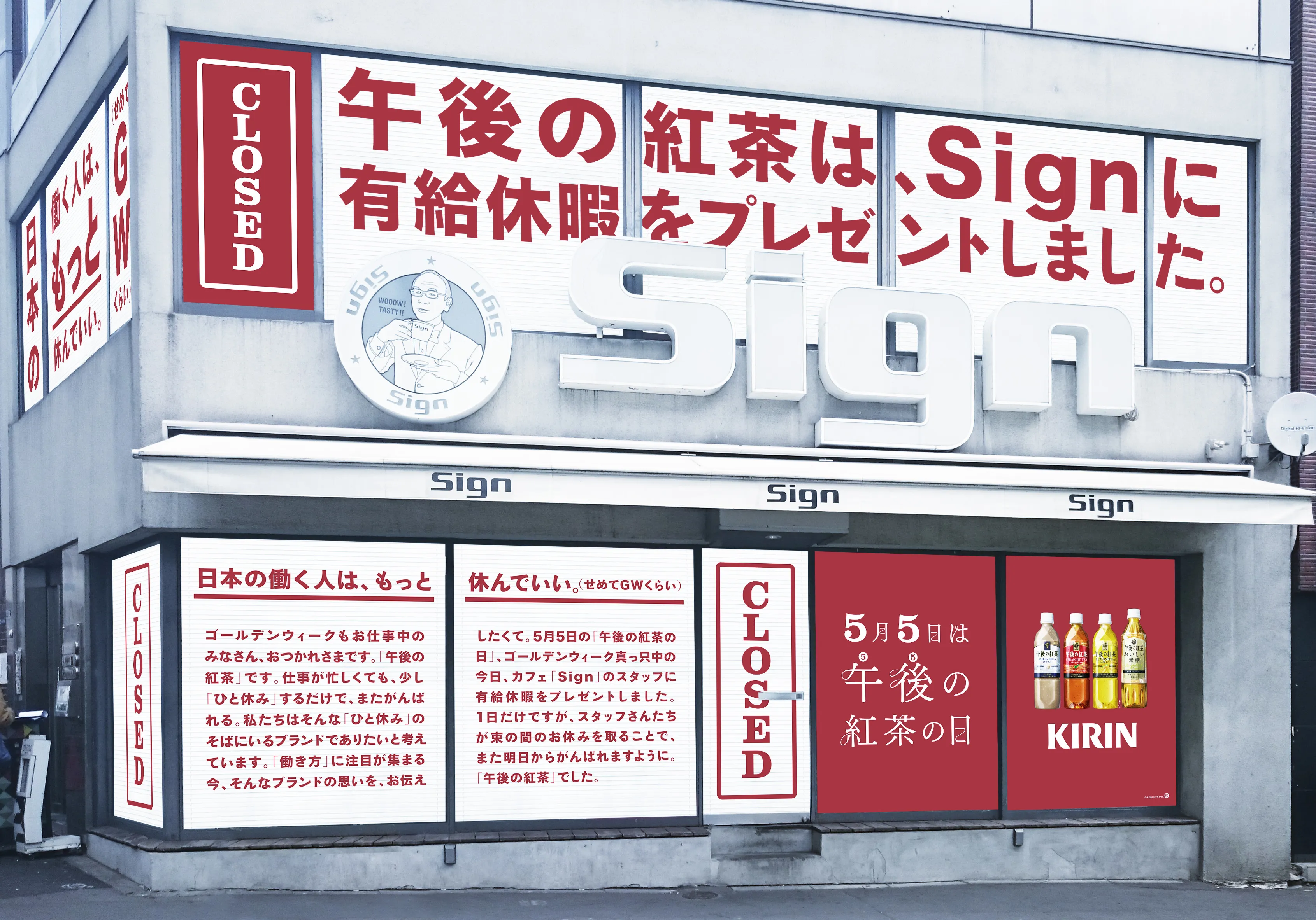 「キリン 午後の紅茶」のブランドコンセプト「がんばっている人に上質な休息を提供する」に基づき、「午後の紅茶の日」である5月5日(金)に、通常であれば営業日であるカフェ『Sign 外苑前』のスタッフに有給休暇をプレゼントします。当日は、カフェ『Sign 外苑前』の外観に「午後の紅茶」の特別装飾を施しメッセージを公開します。装飾作業は前日5月4日(木)の閉店後に開始し、「午後の紅茶の日」当日朝に完成。その一連の様子は、当日正午ごろにKIRIN公式SNSアカウント(Facebook、Twitter)で配信予定です。