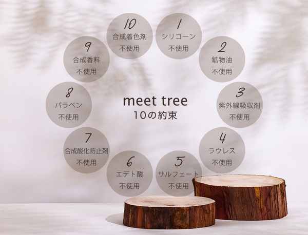 meet treeは人と環境に優しいブランドを目指し、全ての商品において10の添加物(シリコーン、鉱物油、紫外線吸収剤、ラウレス、サルフェート、エデト酸、合成酸化防止剤、パラベン、合成香料、合成着色剤)の不使用を約束しています。