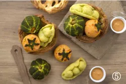 トマト・枝豆・カボチャの彩が良い三種の野菜を使用したもちもち食感が特徴のポンデケージョという種類のパンです。トマトベースのベジソースを付けてお召し上がりください。