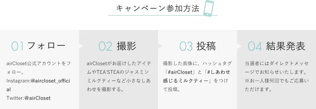 概要:「#airCloset」と「#しあわせ感じるミルクティー」を付けてInstagramまたは、Twitterで投稿していただいた方の中から30名様に「エアクロポイント1000pt」をプレゼント