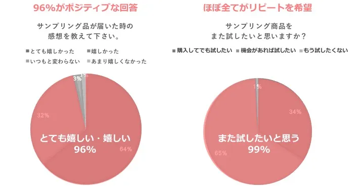 実際にairClosetがこれまでお届けした商品・サービスにご満足いただいた方は、96%以上にのぼります。また、「他の商品も欲しい」とサンプリングを希望している方は99%という結果が出ています。(自社調べ)