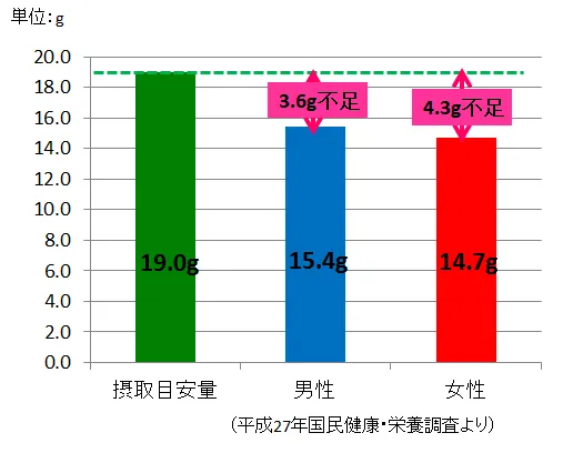 食物繊維は、カルシウム、鉄分などと並んで摂取意向の高い栄養素です。しかし近年、食生活やライフスタイルの変化により、多くの日本人が食物繊維を十分に摂取できていない状況にあります。「栄養素等表示基準値(2015)」での食物繊維の1日分摂取目安量は19gであるのに対し、厚生労働省の「平成27年国民健康・栄養調査」によると、男性・女性(20歳以上)の摂取量は、15.4g・14.7gと男女ともにそれぞれ3.6g・4.3g不足しています。