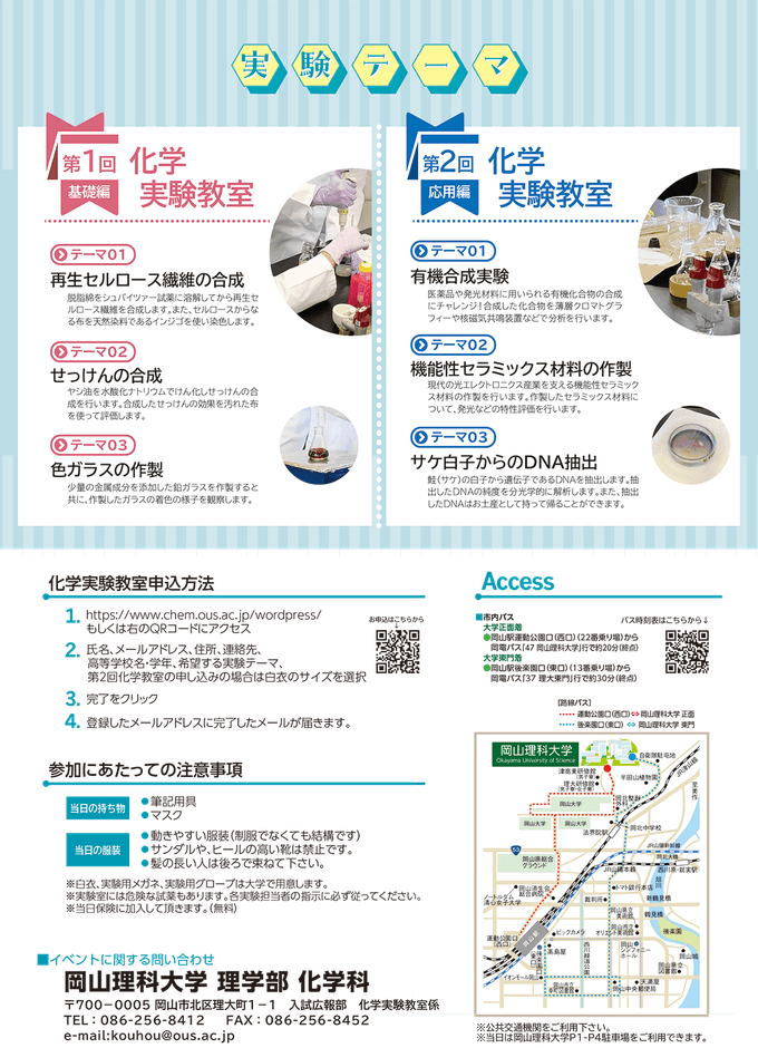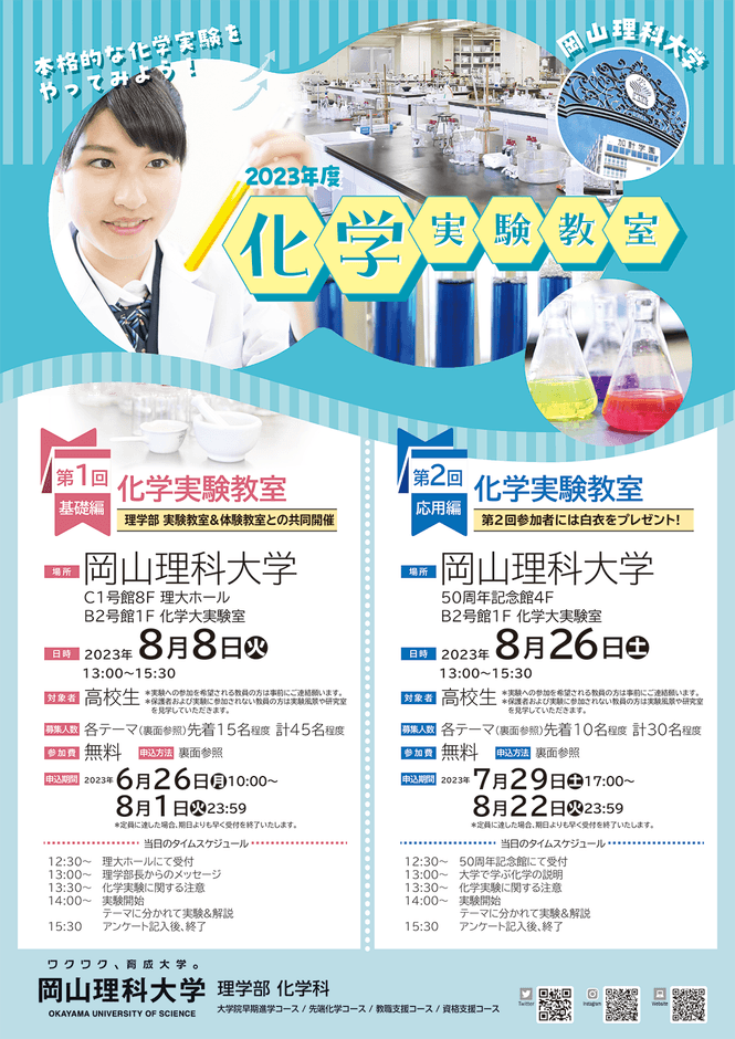 岡山理科大学理学部化学科では、今年度も化学実験教室を2回にわたり開催致します。