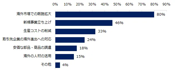「企業が海外市場でのミドル人材の求人を増やす目的は何ですか?」と尋ねると、多かった回答トップ3は「海外市場での販路拡大」(80%)、「新規事業立ち上げ」(46%)でした。「生産コストの削減」(33%)「安価な部品・商品の調達のため」(18%)といった費用低減よりも、事業拡大を目的として募集を行なう企業が多いことが伺えます。