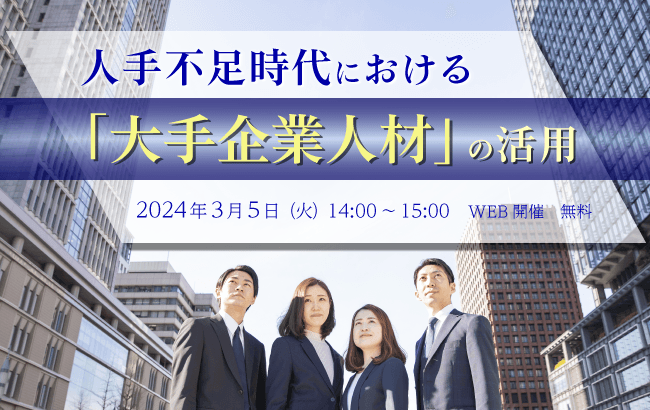 そこで、本セミナーでは、大企業で培った経験豊富な人材を活用することで中堅中小企業の成長と発展にどのように貢献できるかを事例を用いながら分かりやすくご説明いたします。