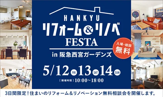 阪急不動産株式会社(大阪市北区:代表取締役 諸冨隆一)のリフォームブランド「阪急のリフォームプラス」では、2017年5月12日(金)・13日(土)・14日(日)阪急西宮ガーデンズにて「リフォーム&リノベFESTA」を開催いたします。