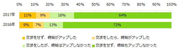 「時給はアップしましたか?」と尋ねたところ、20%の方が「アップした」(「交渉をせず、時給がアップした」「交渉をしたら、時給がアップした」)と回答。2016年の結果と比べ、4ポイント増加しました。「時給交渉をした方」(「交渉をしたら、時給がアップした」「交渉をしたが、時給はアップしなかった」)は25%と、昨年より若干増加したものの、まだまだ少ないようです。時給がアップした方のアップ額、時給がアップした方、時給がアップしなかった方、時給交渉しなかった方のコメントも紹介します。