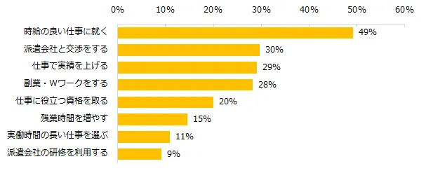「時給アップのために行なっていることはありますか?」と尋ねたところ、第1位「時給の良い仕事に就く」(49%)、第2位「派遣会社と交渉する」(30%)、第3位「仕事で実績を上げる」(29%)でした。時給の良い仕事が見つかれば、現在の派遣先に留まらずに職場を変えたい方が多いことが伺えます。