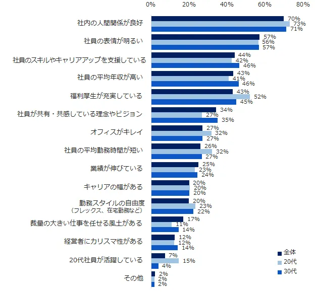 年代別で見ると、まだ仕事経験の浅い20代は「福利厚生が充実している」(全体:43%、20代:52%、30代:45%)、「オフィスがキレイ」(同:27%、32%、27%)、「社員の平均勤務時間が短い」(同:26%、32%、27%)といった衛生要因(働く環境)に関する項目が30代よりも支持を集めています。30代は「社員の平均年収が高い」(同:43%、41%、46%)や「社員が共有・共感している理念やビジョン」(同:34%、27%、35%)が支持を集めました。