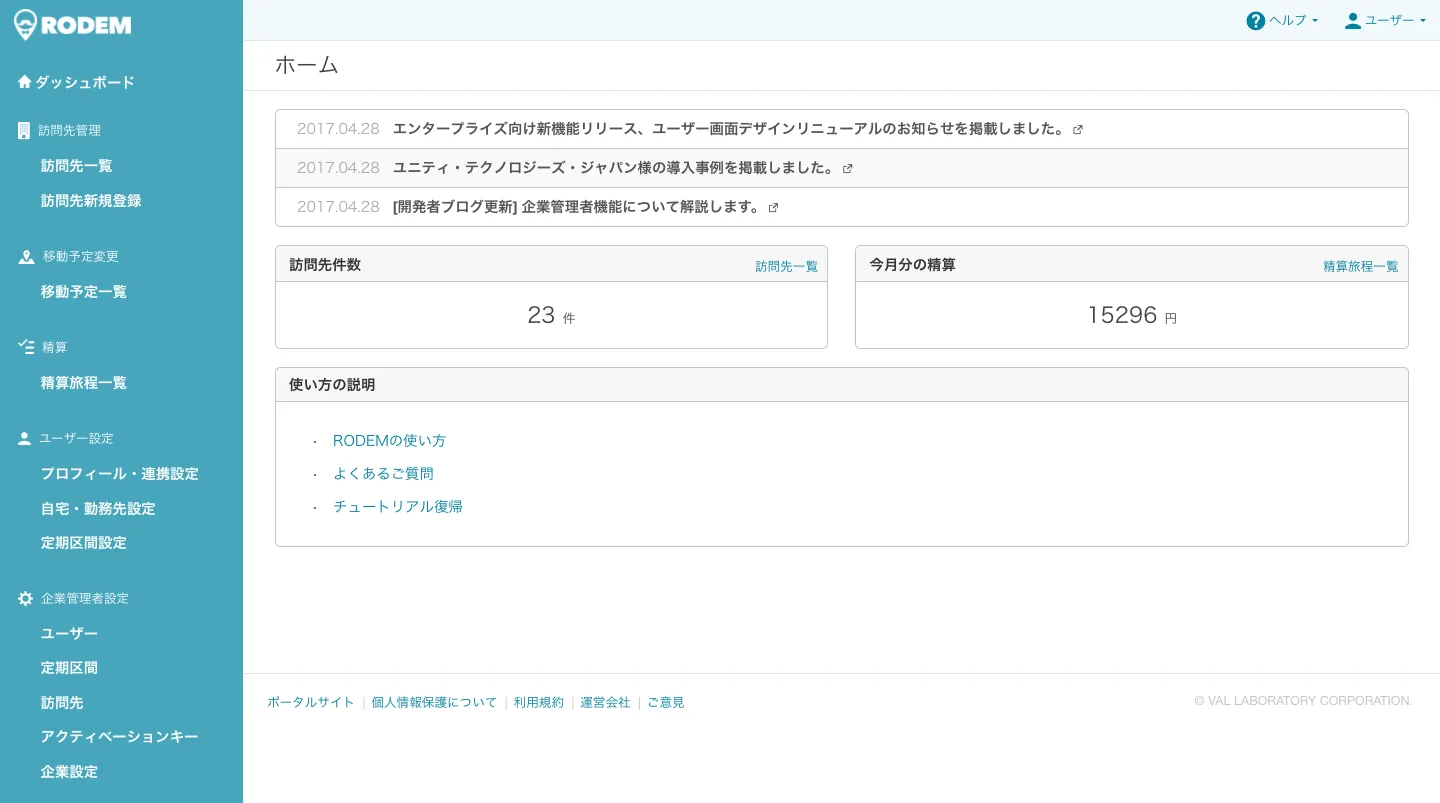 乗り換え案内サービス「駅すぱあと」を提供する株式会社ヴァル研究所(本社:東京都杉並区、代表取締役:太田信夫)は2017年4月28日(金)、 スケジュール調整から交通費精算を自動化するビジネス・サポートサービス「RODEM(ロデム)」のユーザー画面のデザインをリニューアルするとともに、顧客の要望からエンタープライズ向けの5つの新機能をリリースします。