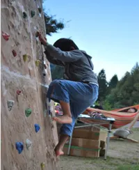 フリークライミングの一種で、ロープなどは使わずに2m程度の人工壁の 突起を伝って壁登りをする話題のスポーツです。