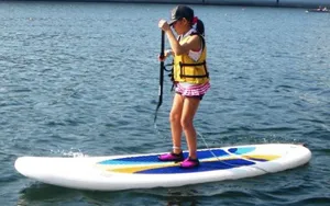 大きなサーフボードの上に立ち、一本のパドルを漕いで進む新しいウオータースポーツです。初めての方でも安心して楽しめます。