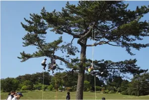 簡単なロープワークでスルスルと木に登れます。木々のぬくもりに触れ、鳥のさえずりや葉が風にそよぐ様子などを感じて、自然との一体感が楽しめます。木の上でのネイチャーヒーリングを体験できます。