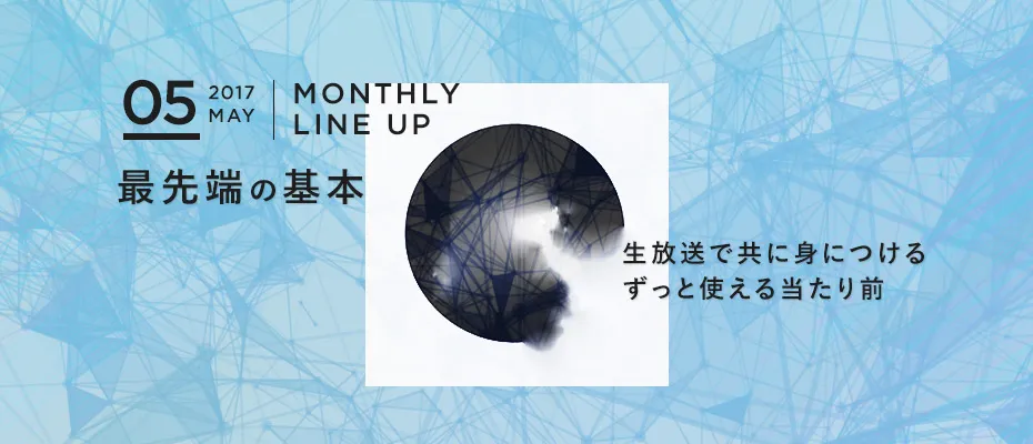 5月のテーマは「最先端の基本」。ITを中心とした技術の進化は、日々新しい手法や解決策を生み出し続けています。デザイン、マーケティング、経営、思考法……、昨日の当たり前は、今日の当たり前だと言いきれない時代ではないでしょうか。そこでSchooでは、最新のテクノロジー・市場動向・考え方に基づいた“最先端の基本”を生放送で学習していきます。