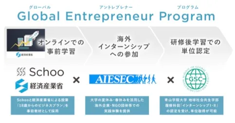 今回、起業を志す人を支援し、大学教材としても広く活用させていきたいという本コンテンツの目的と、アイセックの海外インターン事業を通じてグローバルな視野と起業家精神を持った学生の輩出を目指したいというニーズが合致したことで、共同で起業家育成プログラム「Global Entrepreneur Program」を企画し提供を開始する運びとなりました。