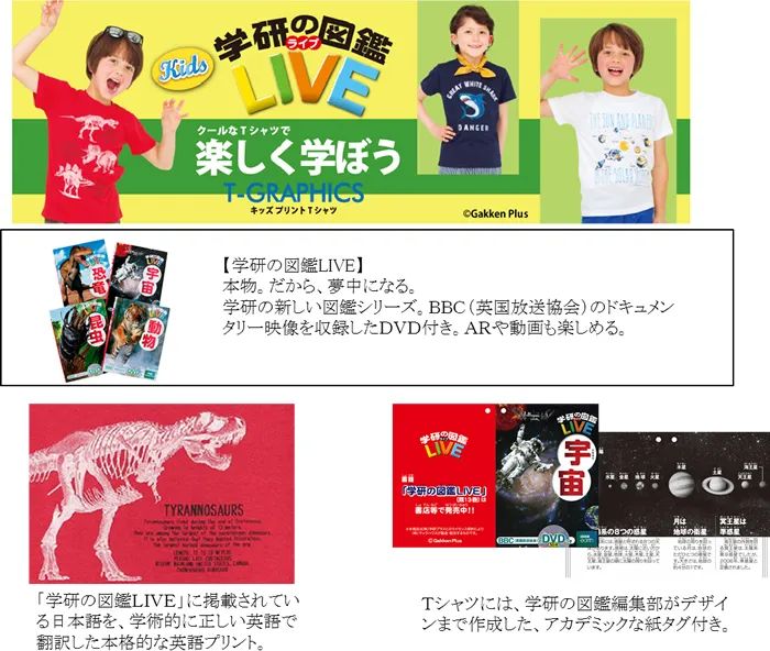 「学研の図鑑LIVE (C)Gakken Plus 」シリーズの中でも特に人気の高い「恐竜」、「危険生物」、「宇宙」をモチーフとしてピックアップし、アイコンとしてクールなデザインにプリント。また、Tシャツにデザインされている英文テキストは「学研の図鑑LIVE」に掲載されている日本語を、学術的に正しい英語で翻訳し、本格的な英語が学べるデザインになっています。