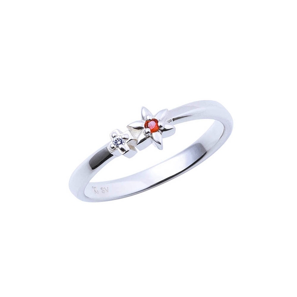 細身で緩やかなウェーブラインのリングにコスチュームの飾りとニンニクの花を取り込み、イメージカラーストーンをセットしました。