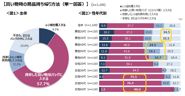 今回は、買い物時の商品の持ち帰り方法や、レジ袋有料化による買い物時の意識や行動の変化、レジ袋購入頻度の変化について分析しています。