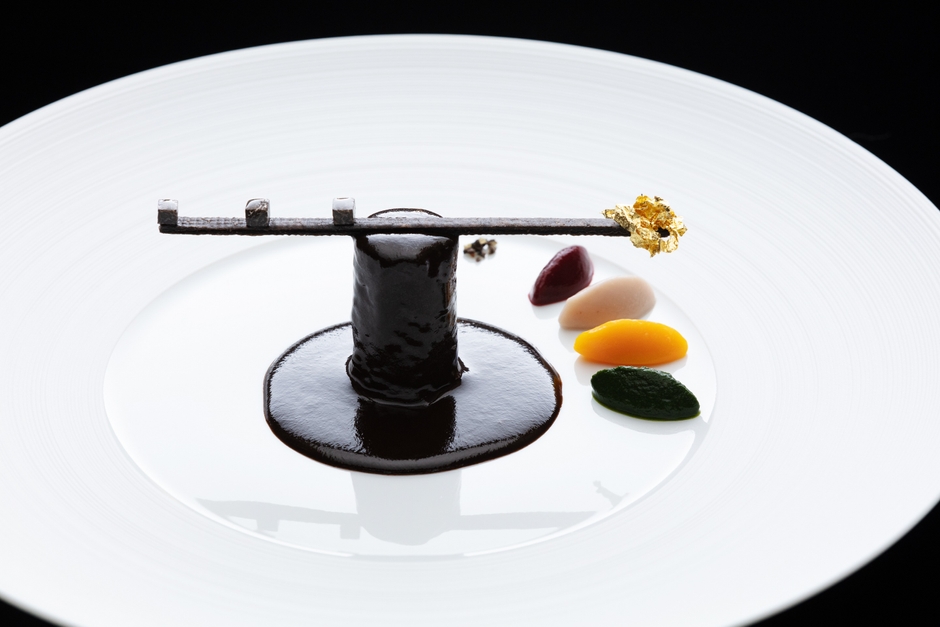 ジビエの女王とも言われる野兎は、野獣臭が強く、パサつき、硬くなりやすいため扱いが難しい食材です。ユカワタンでは、野兎の臭みを感じずに味わえるよう、赤ワインやマデラ酒など数種の酒やエシャロットなどの香味野菜、ハーブ、スパイスなど、何種類もの香りを肉に重ね合わせました。さらに、フォアグラやトリュフとともに2日間、肉がじゅうぶんやわらかなるまで煮込んだ後、1日おいて味を落ち着かせています。フランス料理に欠かせないソースには、野兎の出汁に赤ワインや香味野菜、ハーブ、スパイス、ダークチョコレートなど、いくつもの食材を合わせました。日本人の味覚に合うようまろやかにしています。さらに、長い時間煮込んだり、漉したりを繰り返し、3日間かけて完成させます。