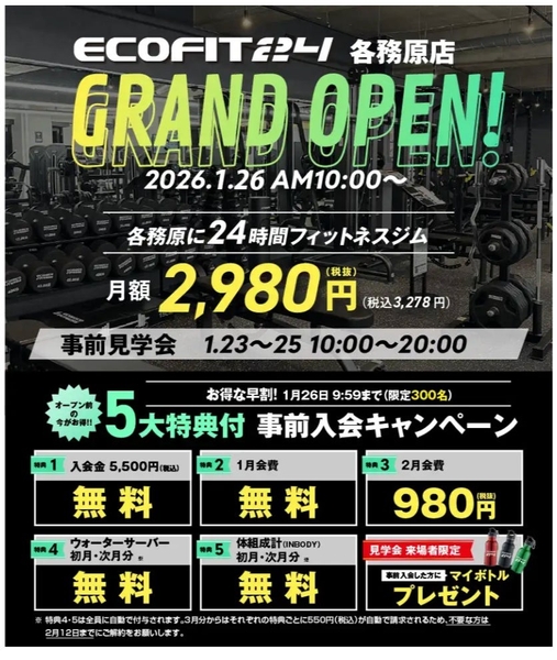 「エコフィット24」各務原店では、グランドオープンを記念し、先着300名様限定で最大9,500円相当がお得になる事前入会キャンペーンを実施いたします。