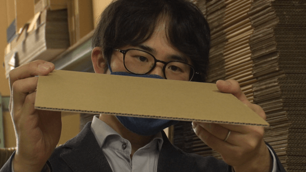 3人目は創業65年、3代続く段ボール箱の専門会社「パッケージアート株式会社」の小林正彦さん。アロマの梱包箱、ギターを入れるための段ボール箱など、通販の拡大でニーズもいろいろ。規格外のサイズにも対応しているため、機械化はせず、職人さんが手作業でカットする姿がありました。