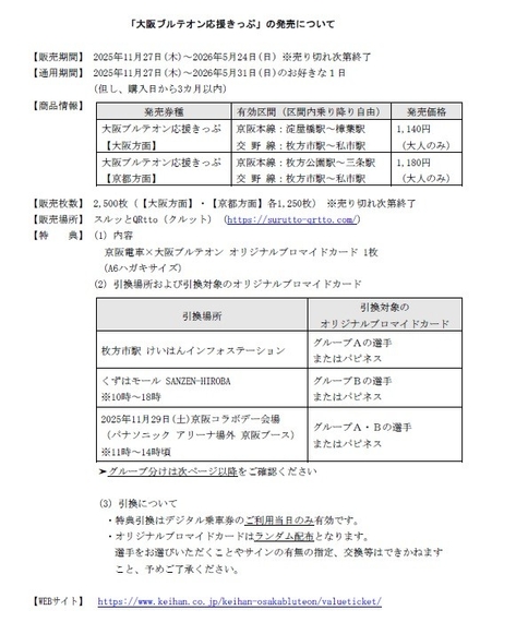 京阪ホールディングス株式会社(本社:大阪市中央区、社長:平川良浩)と京阪電気鉄道株式会社(本社:大阪府枚方市、社長:井上欣也)は、枚方市・寝屋川市・門真市・守口市・交野市をホームタウンとし、地域に根差しつつ世界を目指す男子バレーボールクラブ「大阪ブルテオン」とコラボレーションして、2025年11月27日(木)から2,500枚限定で選手のオリジナルブロマイドカード付きのデジタル乗車券「大阪ブルテオン応援きっぷ」を発売します。