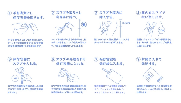 ご自身で簡単に実施できるよう設計されています。綿棒型のスワブを使用するため、一般的に痛みはほとんどありません。詳細な実施方法は以下の画像をご覧ください。